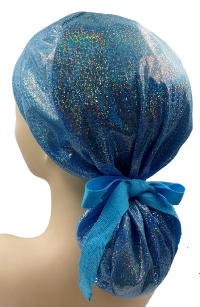 Holographic Iridescent Glitter Light Blue Ponytail Scrub Cap Doctor Theatre Nurse Hospital Paediatric Vet Surgical