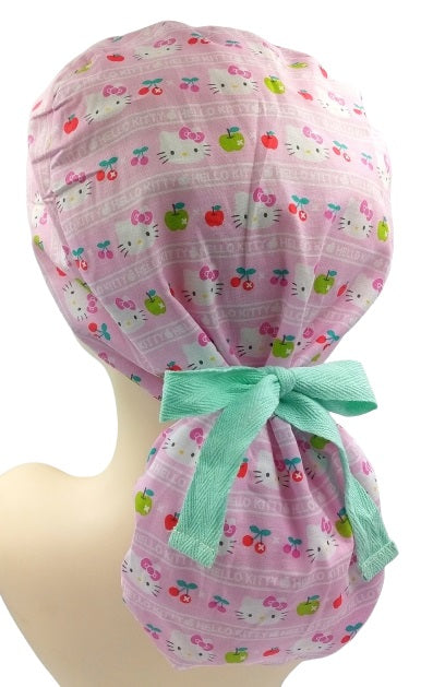 Kitty Pink Fruit Stripe Ponytail Scrub Cap Doctor Theatre Nurse Hospital Paediatric Vet Surgical